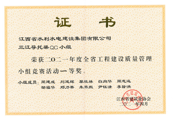 近日,2021年度江西省工程建設質量管理小組競賽活動公布名次,由公司三江導托渠QC小組開展的QC活動榮獲小組競賽活動一等獎。該獎項的獲得,為公司工程創(chuàng)優(yōu)奠定了堅實的基礎,為公司爭得了榮譽,今后,江水建設將繼續(xù)深入開展QC活動,秉承工匠精神推動質量提升,打造更多精品工程,為樹立集團公司品牌形象繼續(xù)努力。