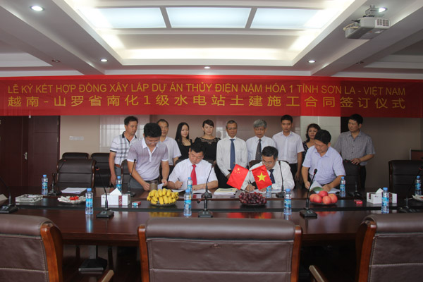 2013年7月22日,越南山羅省南化一級水電樞紐項目建設合同簽字儀式在我公司南昌市總部順利舉行,越南ANPHA水電投資股份公司董事長阮平陽和我公司董事長王元旦分別代表雙方簽署合同。出席簽約儀式的還有越南建設與機電股份公司(MECO)董事長阮玉平、ANPHA水電投資股份公司總經理陳重朵,我公司副總經理張周平、副總工程師鄒春明、項目經理夏愛民等。