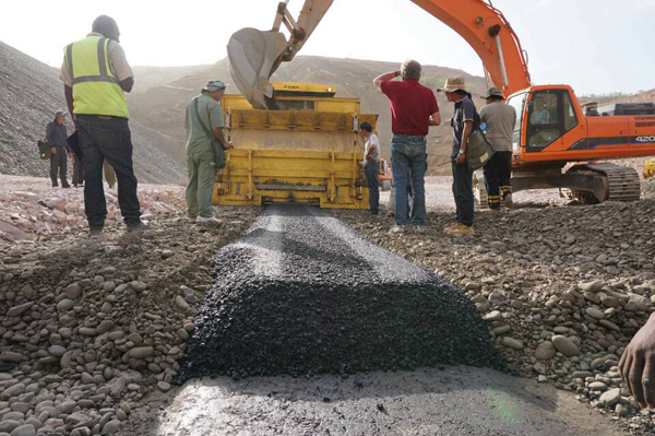 埃塞俄比亞旱季熾熱的風(fēng)撲打著人們的面龐,也映襯了瀝青混凝土芯墻現(xiàn)場火熱的施工場景。自從2015年3月6日簽訂合同以來,Wolkite瀝青混凝土項目施工緊鑼密鼓,在進行了大量實驗和前期準備的基礎(chǔ)上,取得了實質(zhì)性進展,截止5月15日已完成從804m高程至816m高程的填筑,余下工作正有序進行。