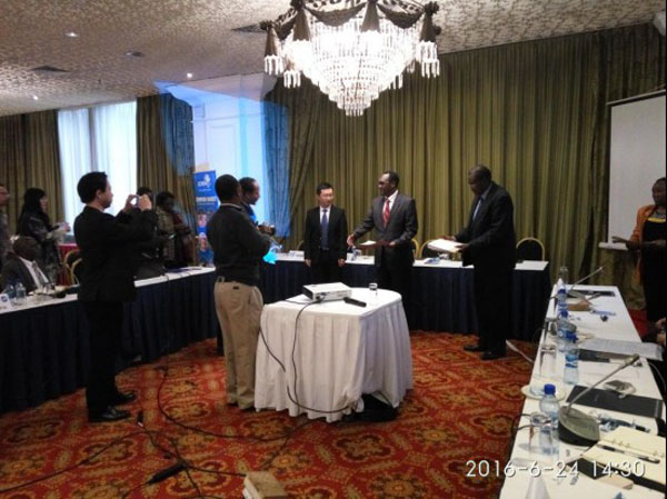 最后董國鋒處長及肯尼亞商務部首席秘書Dr Chris Kiptoo共同為各國代表團成員頒發此次培訓的結業證書。本次活動圓滿落幕。當晚,公司董事、副總經理、海外公司總經理黃鄭民及肯尼亞公司副總經理彭紅軍、經營部副經理丁晨陽一同出席了國際小水電中心的晚宴。