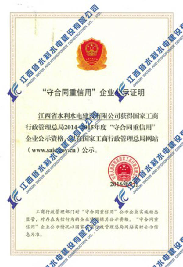 2016年我公司首次榮獲國(guó)家工商行政管理總局2014-2015年度“守合同重信用”企業(yè)公示資格。“守合同重信用”公示活動(dòng),是工商部門(mén)依托合同行政監(jiān)管職能組織開(kāi)展的旨在推進(jìn)企業(yè)信用建設(shè)的“守重”企業(yè)公示活動(dòng),是長(zhǎng)期以來(lái)我國(guó)社會(huì)信用體系建設(shè)的重要組成部分。