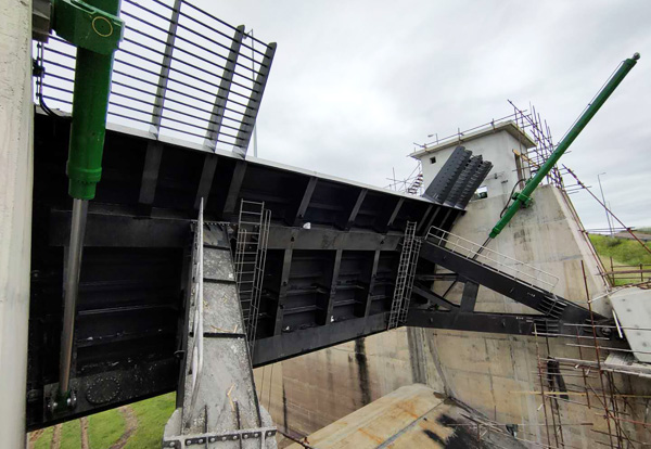 弧形閘門由3片門葉組成,重約70多噸。第一孔閘門的順利提升,鼓舞了項目全體人員的士氣,堅定了大家眾志成城高質量完成項目的決心。