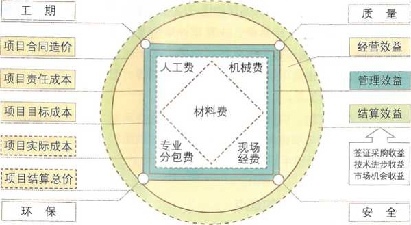“方圓圖”是具有操作性的工具。其一,“方圓圖” 完整詮釋了建筑項(xiàng)目管理行為間的關(guān)系。“接項(xiàng)目”確定了合同造價(jià),對(duì)應(yīng)方圓圖的實(shí)線圓;“做項(xiàng)目”的第一步是下達(dá)項(xiàng)目目標(biāo)責(zé)任書(shū),確定項(xiàng)目責(zé)任成本,對(duì)應(yīng)方圓圖的責(zé)任成本方形,第二步分子公司在責(zé)任書(shū)的基礎(chǔ)上進(jìn)行項(xiàng)目實(shí)施策劃,產(chǎn)生項(xiàng)目的目標(biāo)成本,對(duì)應(yīng)方圓圖的目標(biāo)成本方形,第三步就是項(xiàng)目實(shí)施過(guò)程的管控,最終確定實(shí)際成本,對(duì)應(yīng)方圓圖的實(shí)際成本方形。“算賬收錢(qián)”就是完成項(xiàng)目過(guò)程中的結(jié)算變更與最后的決算收款,從而確定結(jié)算造價(jià),對(duì)應(yīng)方圓圖的結(jié)夢(mèng)造價(jià)虛線圓。項(xiàng)目實(shí)施過(guò)程中進(jìn)度、質(zhì)量、安全、環(huán)保及周邊相關(guān) 方的管理對(duì)應(yīng)成本方形的四個(gè)支撐頂點(diǎn),構(gòu)成成本的五項(xiàng)費(fèi)用“材料、人工、機(jī)械、現(xiàn)場(chǎng)經(jīng)費(fèi)、專業(yè)分包”對(duì)應(yīng)成本方形的內(nèi)部區(qū)域。